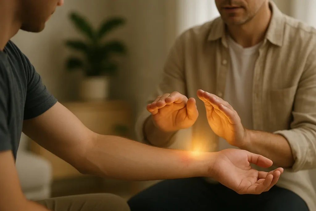 Pendant la séance, que ce soit en cabinet ou à distance, mes mains sont légèrement au-dessus de la zone touchée, sans contact direct. Je canalise l’énergie à travers des passes magnétiques ou des prières apaisantes. Vous ressentez souvent une sensation de fraîcheur, des picotements légers ou un apaisement progressif de la douleur. Une séance dure environ 15 minutes, suffisante pour réduire significativement l’inconfort et favoriser un apaisement rapide. Cette pratique énergétique est complémentaire aux soins médicaux et ne remplace pas un avis professionnel. ✨