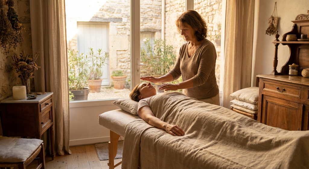 - Séance énergétique — vous êtes confortablement installé(e), habillé(e). Florence travaille avec ses mains à distance du corps ou par léger contact, selon les zones concernées