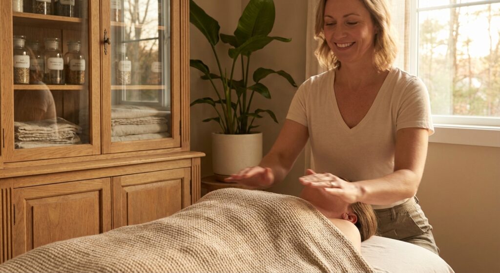 La séance se déroule habillé, allongé ou assis, dans un environnement calme et sécurisant. Florence travaille par imposition des mains, à quelques centimètres du corps, en se concentrant sur les zones de tension identifiées.